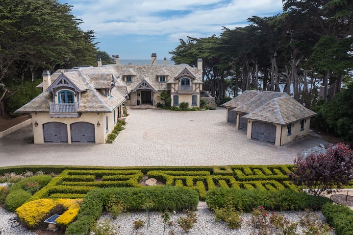 Unsurpassed coastal living, 7,599 sf exquisitely crafted home, 9 BR/5.5 BA, gourmet kitchen, 12 fireplaces, 21 tile murals, manicured gardens, 2 cisterns, elevator, 5-car garage, an additional 1,920 sq ft finished basement with wine cellar and game room. 2 gated entrances, artist's studio, housed generator, waterfall, pond, slate tile roof and caretaker's wing.