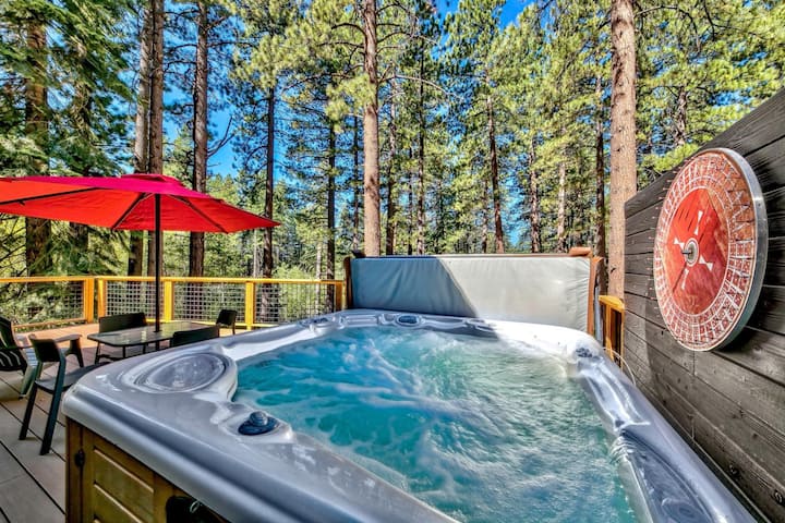 A remodeled A-frame with two large decks in the tranquil Tahoe woods, this cozy 4BR is just a short walk from Heavenly's California Base Lodge. This superb locale is perfect for hiking and other day adventures and features a gas barbecue and a hot tub on the deck, where you can relax and gaze out on the forest views.