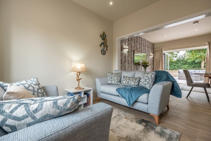 A fabulous detached house built in 2021 by a local company to an extremely high specification. Spacious, luxurious and light-filled with sunlight from the south facing rear garden beaming through bi-fold doors that wrap around the large L-shaped open-plan living area that encompasses the ground floor, Hedgerows is a superb holiday choice for both a multi-generational family and friends.