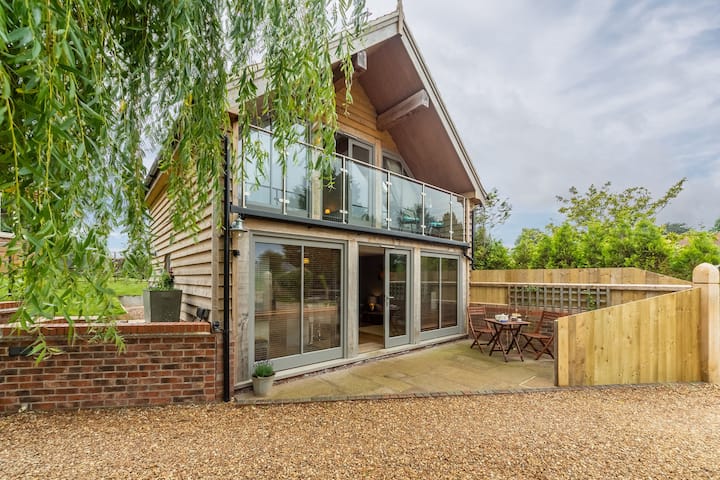 Constructed to high standards in 2017 using local materials, The BeeHive is tucked away on a quiet lane and, with it's fully glazed frontage, offers both outstanding views and light-filled living. The superb, spacious open-plan living area on the ground floor comprises a very well-equipped fitted kitchen, with a large island with dining area to two sides dividing the room. Take a seat on the sofa in the sitting area, and you can simply soak up the view. Bring your binoculars and you might well spot a barn owl quartering in the dusk - or at dawn, if you are an early bird! or a marsh harrier hunting across the meadows. Open stairs lead to the first floor master suite with king-size bed and en-suite shower. Doors open to a decked balcony with a bistro table. The perfect spot for breakfast or a glass of wine as you watch the sun go down.