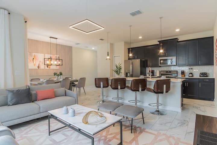 This professionally decorated four-bedroom/three-bathroom townhome has all the essentials for a relaxing and comfortable stay! Enjoy a living room and dining room space ample enough for the whole family.
