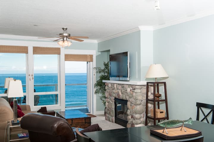 Located on the top floor, The Tides offers miles of breathtaking oceanfront views of the gorgeous Oregon coast.  When not enjoying the view, find rest and relaxation in the private oceanfront hot tub or curl up next to the river rock gas fireplace.