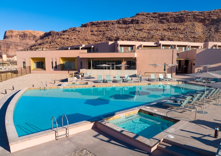 The Moab Resort is a desert retreat complete with top-notch amenities and stunning views of the mountainous surroundings. Get active with a workout in the fitness center before taking a dip in the swimming pool, or soak in the hot tub. Cozy up to one of the fire pits, take a break on the playground, swing by the game room or enjoy the outdoors by grilling a meal at the barbecue area. There is plenty of fun for the whole family to enjoy.