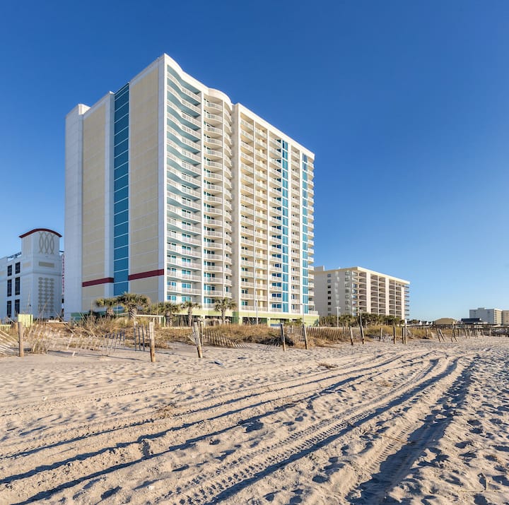 The perfect vacation retreat along the famous Atlantic Ocean, treat yourself to the outdoor swimming pool, lazy river and hot tub. Listen to the sounds of the waves as you relax oceanside with your favorite beverage. Step inside to enjoy stylish art deco furnishings in this two-bedroom family suite. After a full day of Myrtle Beach adventures, return to your private oasis and enjoy a fully equipped kitchen, washer and dryer and private balcony.