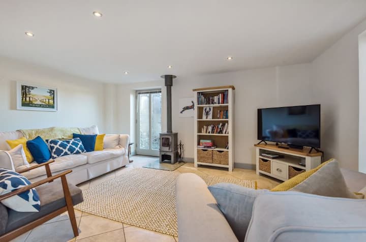 Prospero's Barn is a superb light and spacious barn conversion which has recently been updated by new owners, with a high vaulted ceiling and contemporary fixtures and fittings. Downstairs is open plan with a full-height entrance hall leading into a large well-equipped kitchen dining area and a lovely sitting room with a wood-burner. Upstairs has two high-ceilinged bedrooms each with their own en-suite contemporary shower room. Outside is a quiet patio area perfect for sitting back and relaxing,