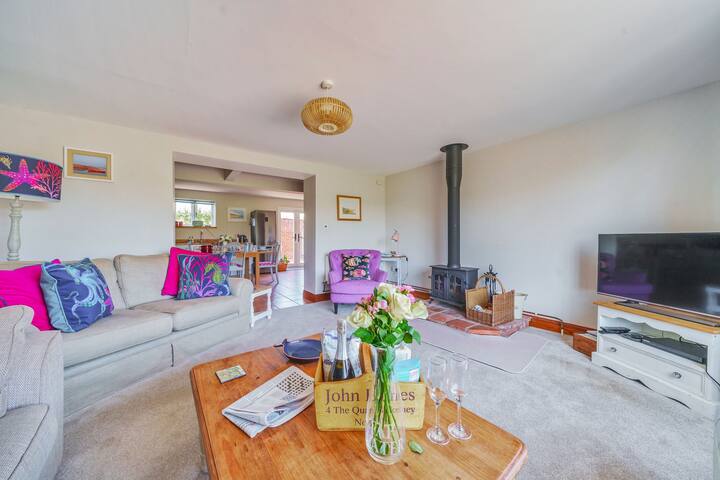Cornloft Cottage is a light and spacious period cottage overlooking the village green, lovingly restored by its owners for use as a holiday home. Downstairs there's a superb kitchen with an Aga electric range and a lovely sitting room with a wood burning stove. There's also the benefit of a downstairs single bedroom and bathroom for less mobile guests. Upstairs there's a high-ceilinged king-size bedroom, a double bedroom and en-suite bathroom. It has the bonus of off street parking for 2 cars. It's conveniently located within walking distance of The Ostrich an excllent local gastro pub, a childrens' playground and tennis court and has the advantage of a private lawned garden. The beautiful coast at Holkham or Burnham Overy Staithe is only 10 minutes drive away, making this the perfect base to explore the stunning North Norfolk coastline.
