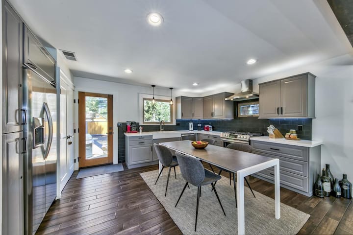 Remodeled in 2021, this single-level home for a family of 4 features gorgeous mid-century American décor and a fully fenced, dog-friendly backyard with barbecue and hot tub. A heated shed offers storage for outdoor gear, and a spacious kitchen accommodates gourmets in the family. You’ll be close to hiking and biking trails and just 9 miles from Heavenly Resort and Stateline and 7 miles from Tahoe’s best beaches.