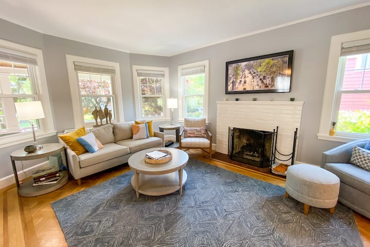 The backyard has an outdoor dining table and landscaped fire pit. Just down the block are riverfront eateries and views!