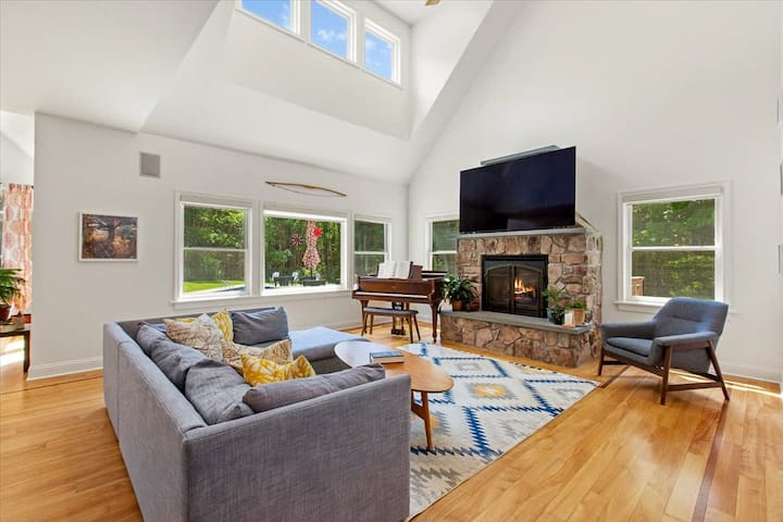 Enjoy outdoor paradise with a pool, hot tub, firepit, and cedar shower. Indoors, bask in natural light, a grand living room, chef's kitchen, and master suite with deep tub.