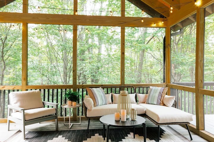 Escape to Olive Pit, a designer home in Hillsdale, NY. This renovated retreat offers 5 acres of tranquility near Copake Lake. Inside, an open floor plan connects an inviting kitchen, dining for 10, and a living room with a fireplace. French doors lead to a screened porch and wrap-around deck with lake views. The primary bedroom boasts a king bed, while lower levels offers play space, plus bedrooms. Outside, a private pool and lake access provide relaxation and adventure. Welcome to Olive Pit!