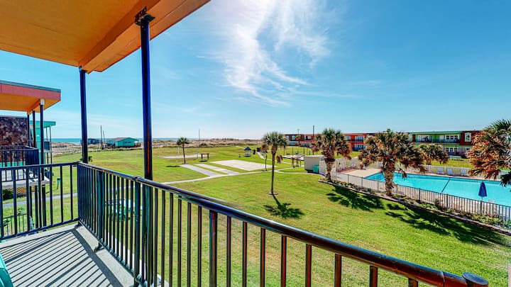 This is a second-floor condo. Step out to the balcony to catch a glimpse of the Gulf over the dunes or overlook the shared pool and courtyard.