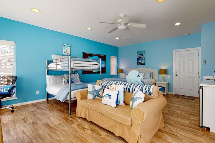 Casa del Sol is located on the bottom floor of building #47 in the gated community at Village Walk. This studio is perfect for a small family or group of friends. The unit features 1 king bed, 1 Twin over Full bunk bed and a sofa sleeper that converts to queen sleeper. Equipped with a flat-screen TV, mini-fridge, Keurig coffee maker and microwave. The property has complimentary Wi-Fi and allows 1 small dog. The community offers two beautiful shared pools that are heated.
