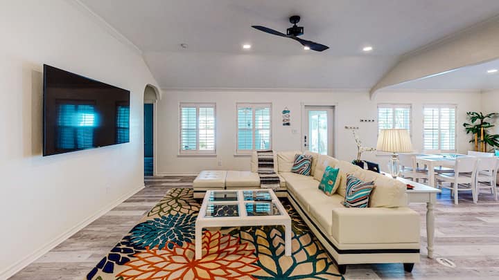Moonflower is a charming, upscale Bahama-style home with plantation shutters on the windows, built-in shelving and colorful décor carried throughout. Located in a beach community with a boardwalk, this home is just a short walk to the shared pool. Golf cart included for entire stay!