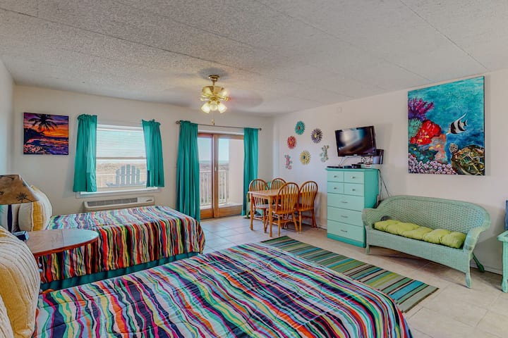 Check out this cozy, affordable second-floor studio condo with boardwalk access and a private view of the Gulf. Eclectic, beach-themed décor is carried throughout. Enjoy sipping your morning coffee or adult beverage on the back balcony in the ocean breeze.