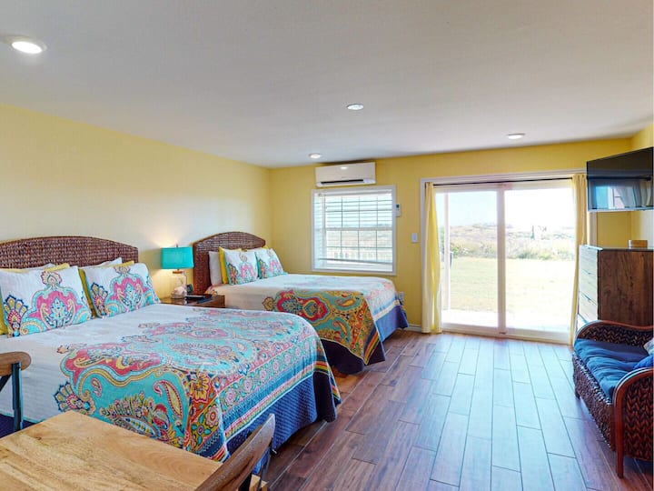 This accessible first floor unit is an affordable and beautiful option for four people to get away to the beach. Open Studio Efficiency, Pale yellow walls welcome relaxation. Leave your worries behind!