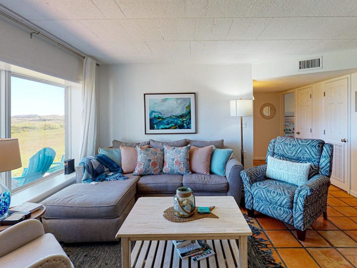 This first-floor unit has a fully equipped kitchen. Enjoy the sea breeze and ocean sounds, simply step out onto the private patio with lounge chairs
