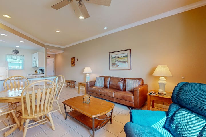 You will be wowed by the beautiful wood and comfortable furniture in this condo. Metal dolphin artwork swims above the TV pointing the way to the private patio that overlooks the shared yard with a pool, playground, and partial views of the Gulf.