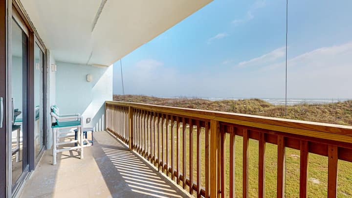 A first-floor ocean view condominium. This condo sits just above the dunes and is a newly updated, 2-bedroom, 2-bathroom condo that sleeps 6. The kitchen, living room, and dining room flow together and have a beautiful view of the beach through the floor to ceiling balcony windows.
