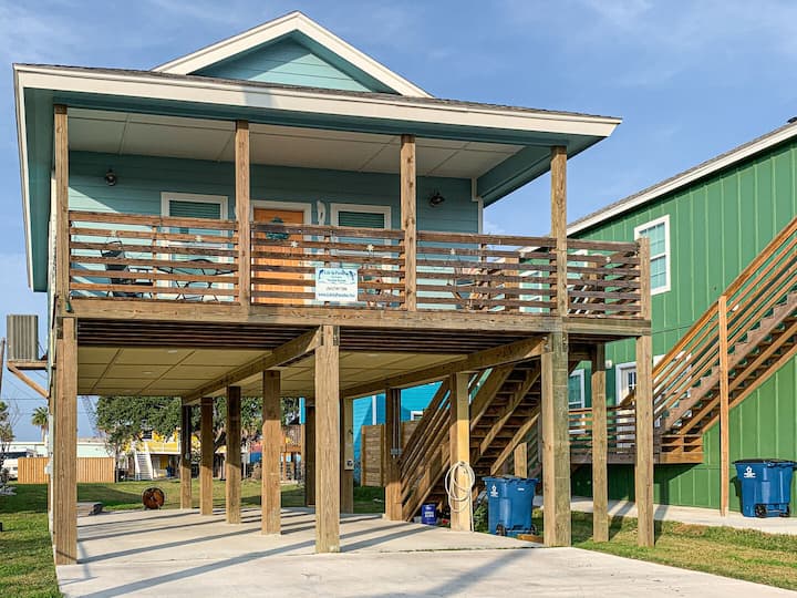 This is a brand new, adorable home on stilts located in town within walking distance to shops, restaurants and bars. There is ample parking for 4 vehicles or watercraft and golf cart. Enjoy sipping your morning cup of coffee in the island breeze of the front balcony or just cooling off from a day of fishing. This home is conveniently located  0.2 miles from restaurants, shops and bars. 0.8 miles to the Beach, 0.7 miles to the Marina.