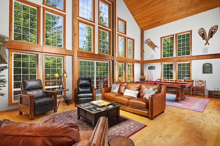 Lazy Bear Lodge is a comfortable custom-built lodge with relaxed mountain décor along the golf course in the Mt Hood Village of Welches. The vaulted great room on the main level includes floor-to-ceiling view windows, a gas fireplace with rock chimney and pool table. Just around the corner is the 12-person dining table and the spacious kitchen. Downstairs is the kids' game room with big screen TV, Foosball table, old-school style arcade game with PacMan, Donkey Kong and more.