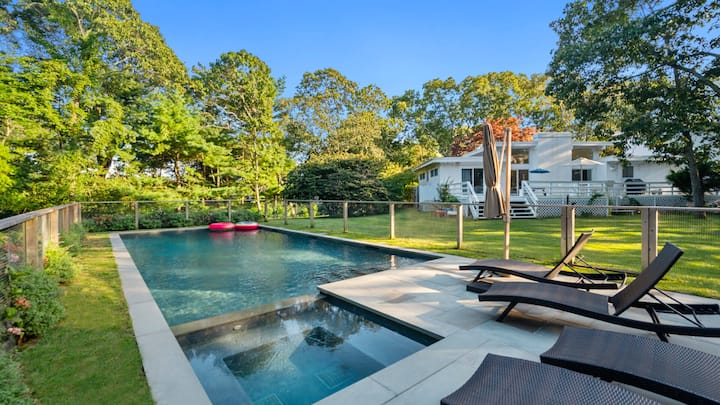 4BR/5BA: sleek white interior, open floor plan, oversized windows, extra high ceilings, brick fireplace, and large kitchen