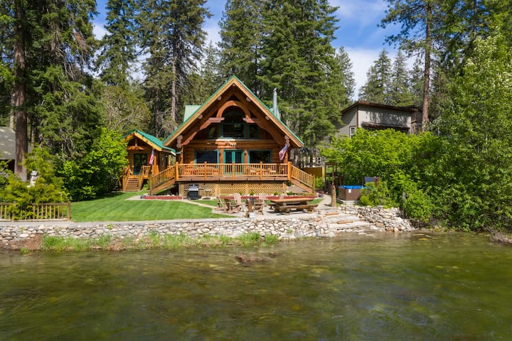 Moose Head Lodge is an ultra-comfortable mountain log cabin retreat resting on the bank of the Wenatchee River in the Leavenworth community of Ponderosa Estates. This hand-hewn log home earns a 10 out of 10 for quality craftsmanship, enduring design, and prime riverfront location. One of the best low bank riverfront settings in the entire Plain Valley. The private park-like oasis includes a stone staircase down to the sandy beach, a 6-person hot tub perched just above the water's edge.