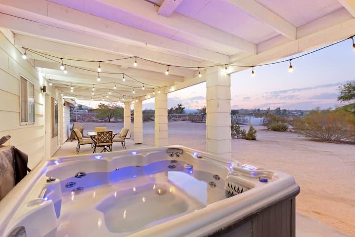 The Golden Desert Ranch is your desert home away from home. This property gives you tons of space inside and out to relax and enjoy the peace and quiet. With 3 bedrooms, 2 bathrooms, a spacious living and dining area there is plenty of room to spread out and relax with friends and enjoy the beautiful scenery and amenities of the property. The backyard gives you a true desert experience; relax in the hot tub, cook smore's over the fire pit and stargaze in the hammocks. We welcome you home!