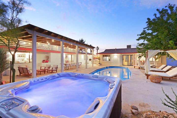 Welcome to Casa Coyoacan, a comfortable and inviting desert oasis just minutes from Joshua Tree National Park. We hope you will enjoy the refreshing in-ground swimming pool, luxurious hot-tub, comfy poolside cabanas, well equipped kitchens, spacious dining areas, lavish hotel-style bedrooms, and the all-around great vibes.