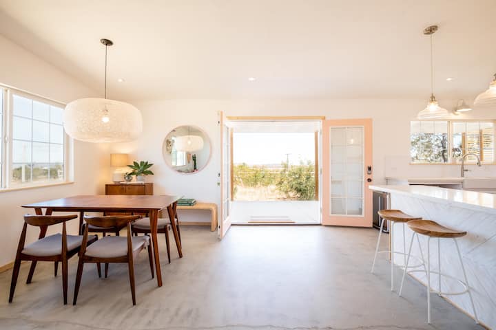 Come live out your desert dreams in our newly remodeled stylish desert house. This property is secluded and surrounded by an abundance of desert landscape with endless views of the dark skies. The Flamingo Ranch boasts 2 bedrooms, 2 bath, a large bright living room, full kitchen, indoor and outdoor dining area, hot tub with out door shower and comfortable outdoor seating to sit back, relax, and enjoy the stars above.