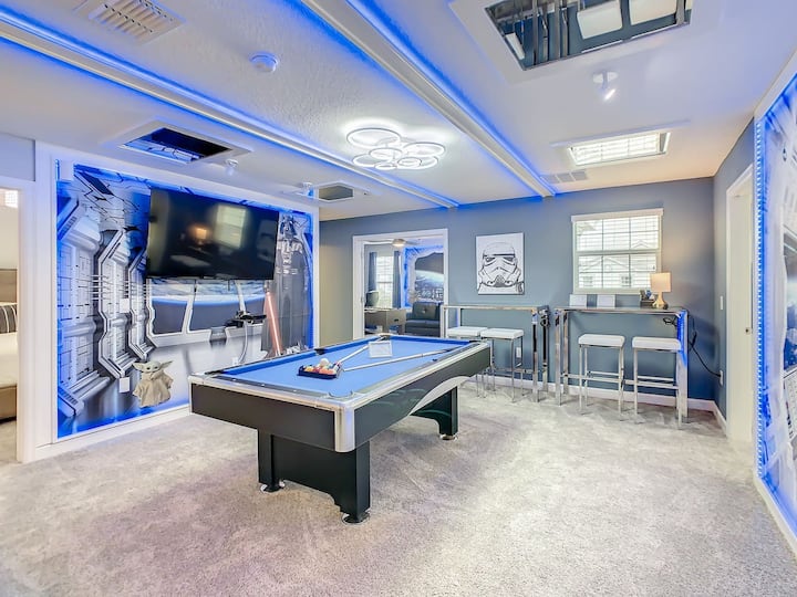 Elevated Stays' 8-bedroom masterpiece is a luxurious vacation rental home that offers an immersive experience in a futuristic spaceship-theme. Recently renovated, this property features custom Star Wars-themed rooms, a private pool, a custom movie theatre, and a game room. With comfortable sleeping arrangements for up to 18 guests and a prime location just a few miles from Orlando's theme parks, this vacation rental home is the perfect destination for an unforgettable family vacation.