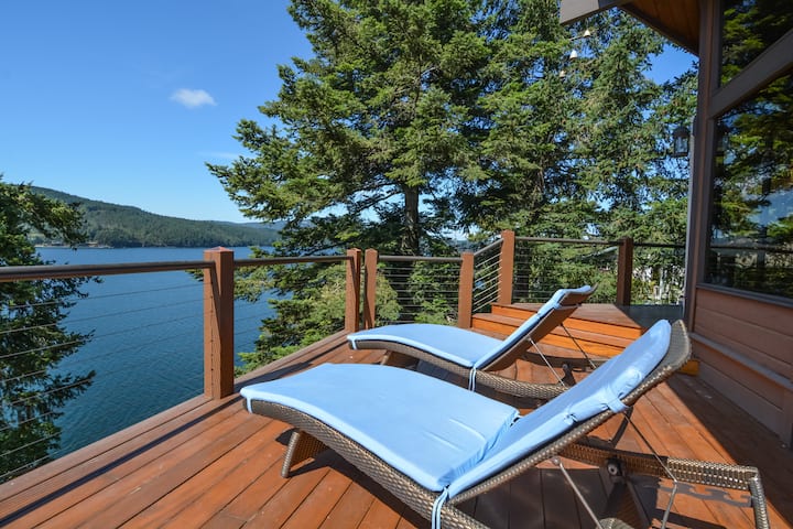 This modern island cabin is perched on high bank waterfront and is ideal for a small family or couple to enjoy. The home is within walking distance to the amenities of Rosario Resort.