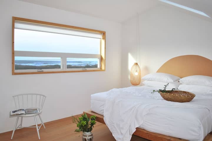 Intentionally designed with organic materials, this home can sleep up to six people. Downstairs features a bedroom with a bathroom across the hall. Upstairs you will find a loft sleeping space (with a king bed that can be split into two twins) and a romantic primary suite with ocean views, skylights and an on-suite bathroom with a custom walk-in shower. An attached sunroom houses a new washer and dryer for ease of stay and daily adventuring. This home has had a new water system!