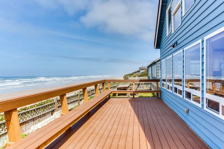The perfect spot on a magnificent stretch of sandy beach is waiting for a relaxing couples' gathering or a family getaway! Halfway between the quaint Oregon beach towns of Yachats and Waldport, this tasteful beachfront home provides the perfect getaway for up to 6 people. Just 18 steps down your private stairway to the beach, Heron Song is located on a quiet dead end street with ample parking and features a lawn area, hot tub, and expansive deck overlooking Tillicum Beach.