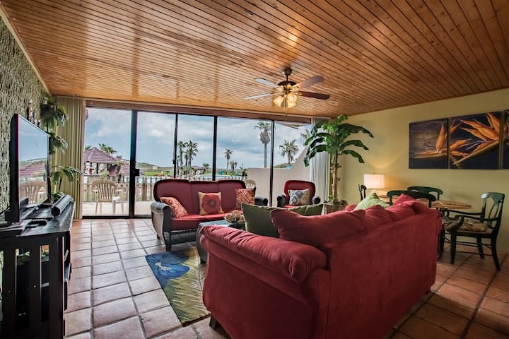 First floor two-bedroom, two bath vacation rental condo offers a beautiful view of the pool area as well as a partial ocean view.