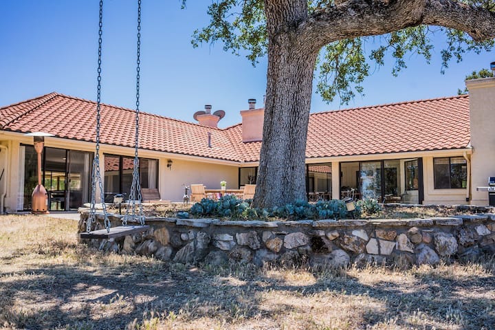 Spacious retreat for 8 on privately-owned hilltop! This home was built for entertaining and features a well-equipped kitchen and phenomenal indoor/outdoor dining with large open spaces and outdoor propane grill. Entertain yourself with ping pong, billiards, darts, piano, more. Walk among the oaks, explore hiking paths or view barn animals. Close to wine country, yet minutes from Lake Nacimiento. Just 20 minutes from Paso Robles (This home is cooled by swamp cooler, rather than air conditioner.)