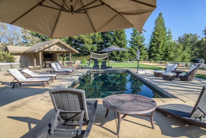 Luxury main house for 10, plus gorgeous Guest House for additional four guests. Outdoor amenities galore in private, rural setting with bocce ball, swimming pool, volleyball, horse shoes, outdoor flat screen TV and dining amenities.