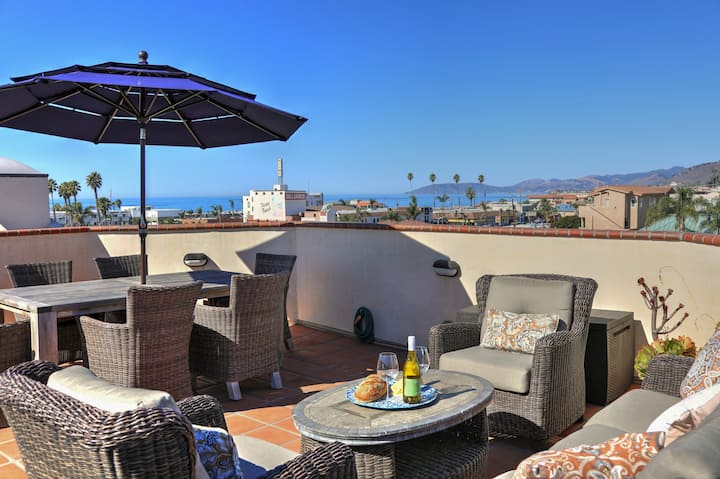 Embrace stunning ocean and mountain views in our 3-story condo. It boasts 3 bedrooms, 3.5 bathrooms, a rooftop oasis with a fire table and dining, plus a 2-car garage. The versatile floor plan is perfect for a romantic getaway or a family vacation.