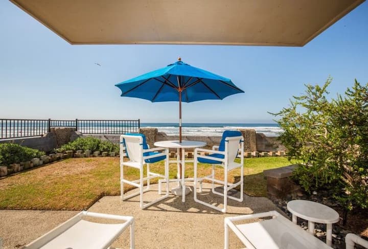 Unit D-15 is considered one of the premier units at North Coast Village. It is a bright, freshly updated, oceanfront corner unit with Panoramic ocean and pier views from the living room, dining room, kitchen, and master bedroom. It’s on the ground floor and it’s 2 walk-out patios have unobstructed views of the beach and beautiful sunsets. Unlike most units, there are no steps! It also has 2 garage parking spaces. Sleeping King, Queen & Twin Bunkbeds