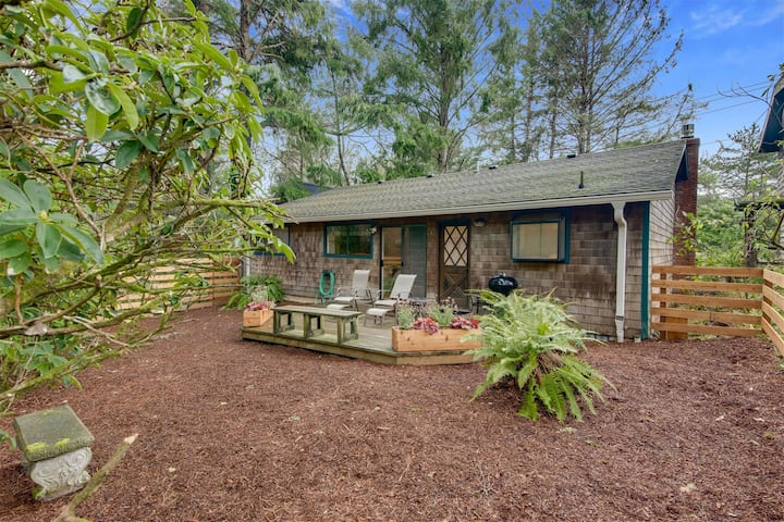 Tucked away in lush ferns and towering trees, this charming cottage captivates guests with a storybook-esque setting to spend time with loved ones. The hero of this haven — the deck — bestows a secluded sanctuary to breathe in cool air from the ocean while sipping a warm cup of coffee. The home’s mid-town location and ample parking space allow for a short walk