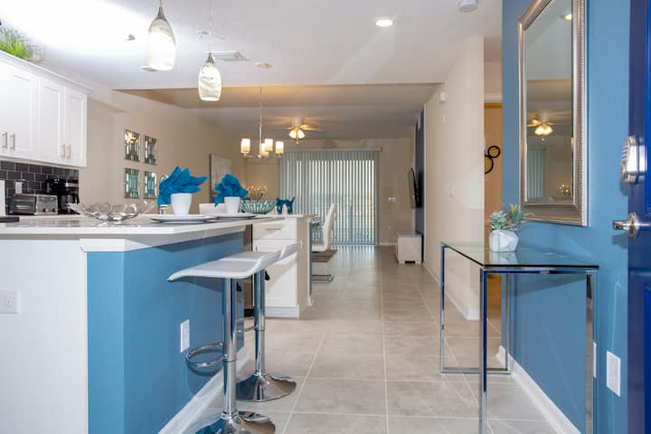 One-Floor: Dining Area, Living Area w/ Queen Size Sofa Bed, Master Suite w/ KingSize bed an en-suite bathroom, Second Bedroom w/ TwinSize bed + Full-Over-Full Bunk Bed, Game Area, Washer/Dryer, 2nd Full Bathroom.
