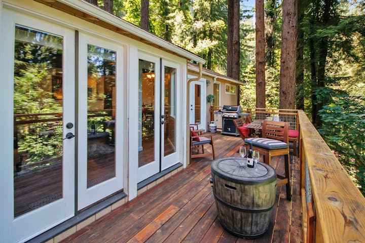 Welcome to The Grove, a world of privacy, with redwoods all around. Perched on a hill above the Russian River, there is a lovely back deck equipped with a large gas grill, dining table and wine barrel gas fire pit. There is a home theatre system, with 120 inch projector screen and surround sound, great for watching sports and movies. Climb into the secluded spa and you are in the middle of a fairy ring of towering 175 foot redwood trees that lead your gaze up to the stars.