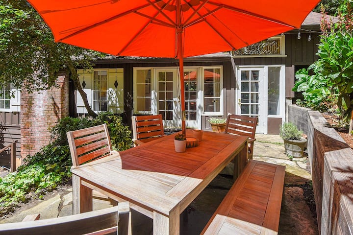 Sunshine Grove preserves the vintage charm of its 1920's roots, blended with modern amenities such as a freshly remodeled kitchen with stainless steel appliances, new touches in the bathrooms, and cozy comforts throughout. Beautifully refinished wood floors, an open beam ceiling in the living room and multi-paned windows add to the charm. French doors open to a private dining patio with gas BBQ and deck with a hot tub.