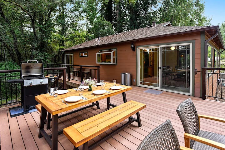 Zen Retreat is the perfect spot to embrace nature and relax. This half acre haven includes certified wildlife habitat, a home orchard, redwood grove and guest garden with culinary herbs, strawberries, grapes, greens and veggies – depending on the season. As you stroll through the garden, sit next to the pond and listen to the trickling water as blue jays call to each other and deer pass by. Embrace relaxation throughout the house too.