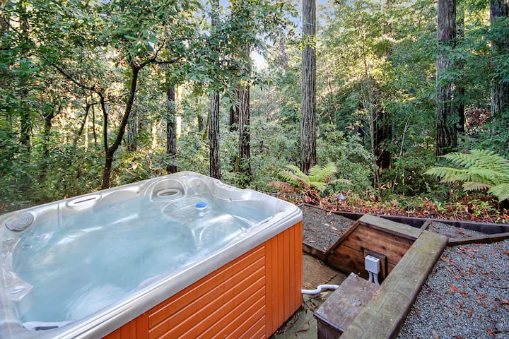Poet’s Corner is a relaxing hideaway, offering privacy and comfort. The peaceful surroundings and warm, inviting interior spaces work to release worldly concerns and leave the mind inspired. Poet’s Corner is easy to access, but feels far away from it all. Parking is convenient and it is just a couple of steps from the driveway to the front door. Any season is a great time to soak in the amazing hot tub under the redwoods, enjoy a BBQ on the back deck or curl up in front of the cozy fireplace.