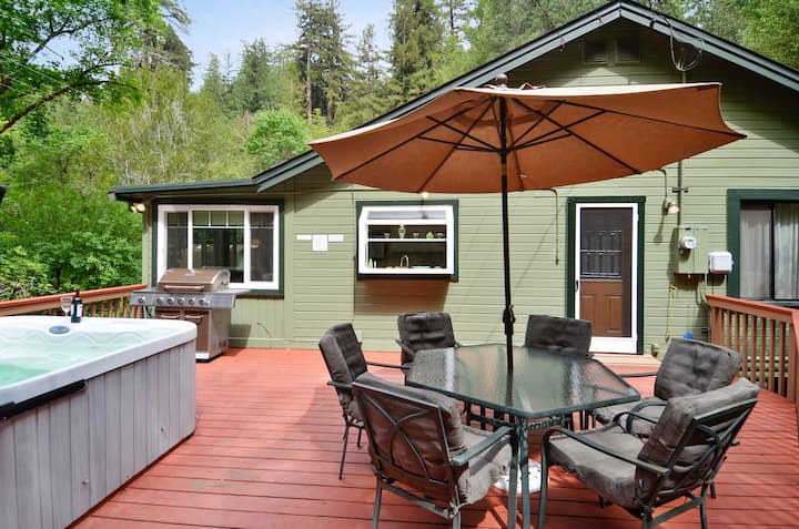 Glen Tara is Cazadero at its best! This out-of-the-way private creekfront home features redwood paneling, open beam ceilings and a dining area with views of Austin Creek. Enjoy the sunny outdoor deck, complete with a gas BBQ and seating for outdoor dining, perfect for an alfresco dining experience. Set aside some time to relax in the spa as well and to explore Austin Creek. You can always curl up with a good book while enjoying the sound of the creek's gurgling waters.
