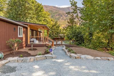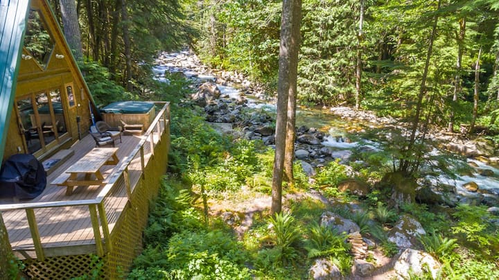 A River Runs Through it is a charming A-Frame set in a totally private, wooded setting surrounded by towering trees, slabs of moss-covered granite, and the crystal- clear Index Creek running directly below. The cozy and warm interior boasts the classic “cabin in the woods” details, with river rock fireplace, cedar walls, unique stone sink, and stone surrounded clawfoot tub. The loft bedroom feels tucked away from the world with the sound of the river lulling you to sleep.