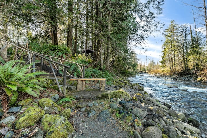 Wallace River Retreat is an enchanting private and peaceful escape set just 1h from Seattle in the foothills of the Cascade Mountains at Stevens Pass. The fully fenced 1 1/3 acre features a large hot tub, fire pit, mossy trails, fruit trees, towering conifers, hand carved art around every corner and private Wallace River access. The riverside studio offers a cozy place for musicians to gather- instruments provided! – or a meditative morning reflection.