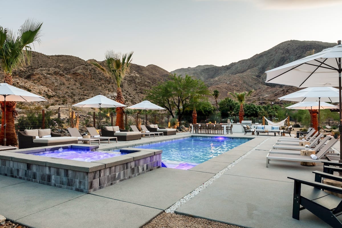 This private oasis, located in Palm Desert, is the ultimate getaway. Inside, sleek wooden accents mingle with earthy tones and plenty of natural light. Chill out in the hammock garden, soak in the hot tub, or play a round of bocce ball or volleyball on the sand court. Two saltwater pools provide a refreshing escape from the balmy heat. Scenic hiking trails are just a short drive from the villa.
