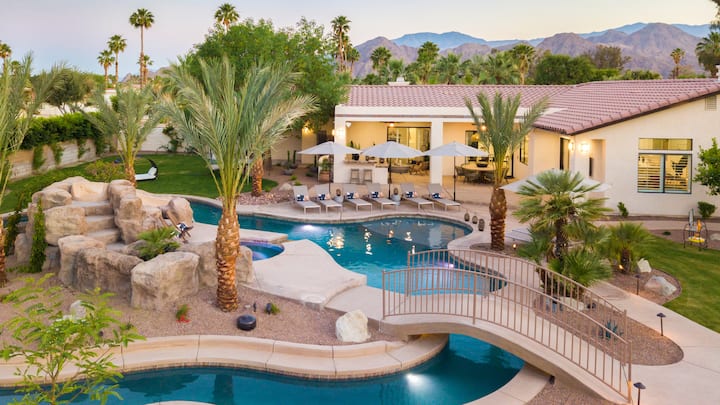 Sun seekers have a run of this 1-acre, lush outdoor space, consisting of a large swimming pool with lazy river and water slide, hammocks, sun loungers, fire pit, putting green, citrus garden, half basketball court and a sand volleyball – all surrounded by views of the mountains and desert sky.