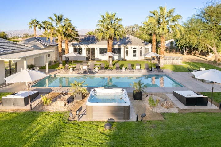 Sunset views of red rock mountains framing Coachella Valley is just one of the many amazing qualities of the Strut Oasis villa, professionally redesigned in December 2021 and conveniently nestled in the heart of world-class sporting events, walking distance to music festivals, dining, shopping & more!